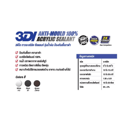 - 1 หลอด บรรจุ 460 g - มี 2 รุ่น รุ่นหลอดสีแดง(คุณภาพมาตรฐาน) และหลอดสีน้ำเงิน(คุณภาพสูง) - กาวอะคริลิคสำหรับยาแนว แบบชนิดเนื้อด้าน ทาสีทับได้ - ใช้ยาแนวตามรอยแตกของผนังคอนกรีต ขอบหน้าต่าง วงกบไม้ หรืองานก่อสร้างทั่วไป - ป้องกันราดำ